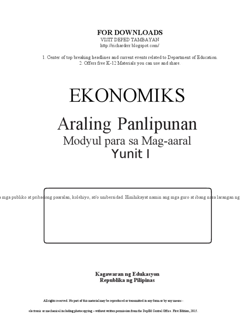 Sa panimulang aralin na ito ay mauunawaan mo ang PDF ARALING PANLIPUNAN 10 ISYU AT HAMONG PANLIPUNAN Panimula at Gabay na Tanong Pro Fess Erato - Academiaedu Academiaedu no longer supports Internet Explorer. Bahaging Nagbibigay-lunas o Nagpapayaman 125 Tunghayan ang pabilog na tsart sa ibaba. Ngayon ang salitang ekonomiks ay itinuturing na isang siyensiya ng pamamahala upang magamit nang mabisa ang mga kapos na pinagkukunang-yaman at matugunan ang sari-saring pangangailangan ng bawat tahanan.